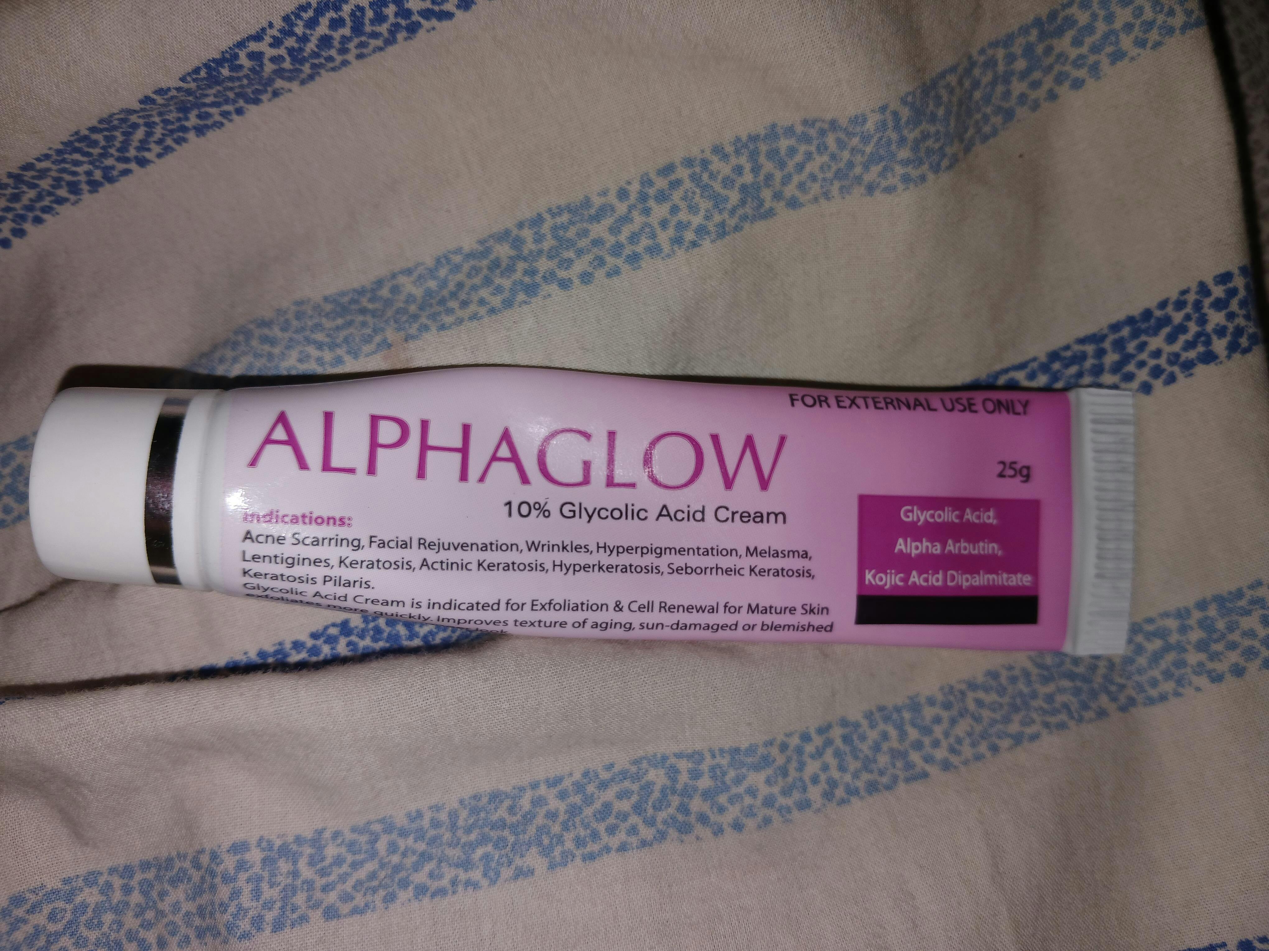 Alphaglow is a powerful exfoliating and skin-lightening cream combining 10% Glycolic Acid, Alpha Arbutin, and Kojic Acid Dipalmitate.